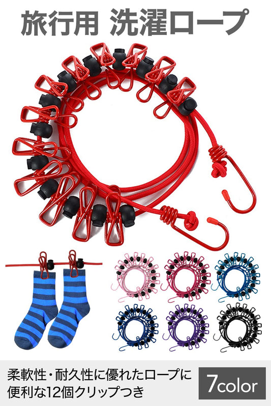 [river beach] 洗濯ロープ 旅行用 物干しロープ 12個クリップ付き (レッド)