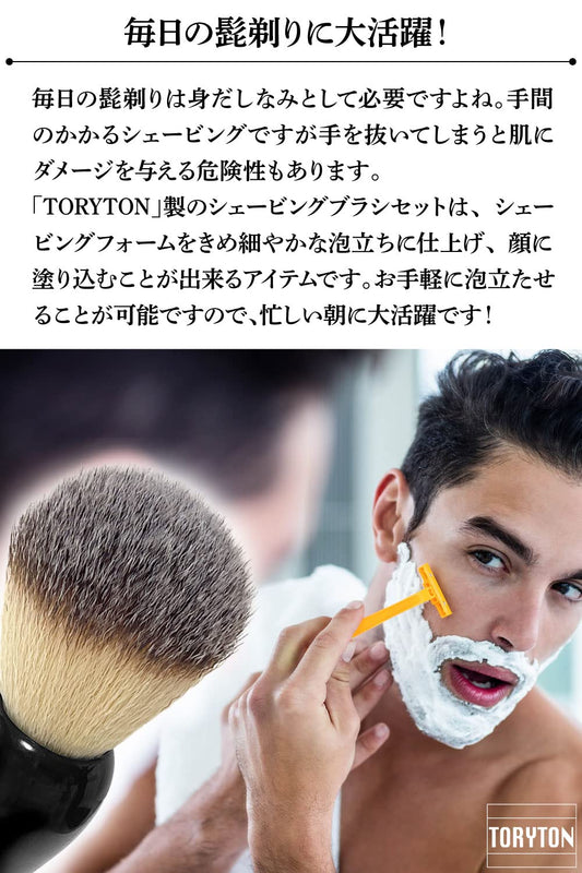 [TORYTON] ひげ シェービングブラシセット (ブラシ/スタンドホルダー/ボウルの3点セット) 毛質:ナイロン (ベージュ)